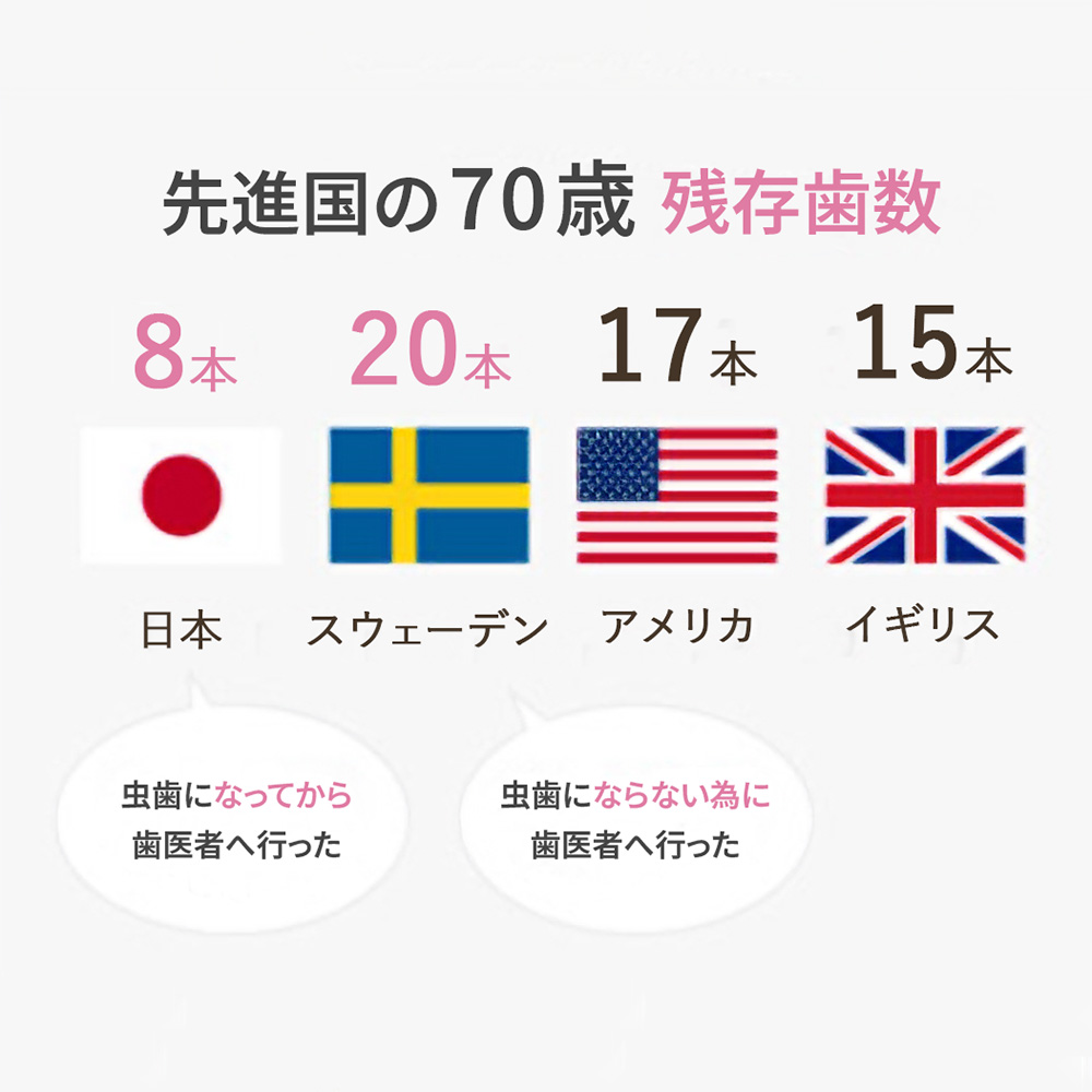 特に、50歳を超えた日本人の半分以上、また75歳を超えると6割~7割程度の患者さんが入れ歯に頼っているのが現状です。これに対し、欧米人は同じ年齢でも残在歯数は日本の倍程度(20本程度)の本数が残っていると言われています。