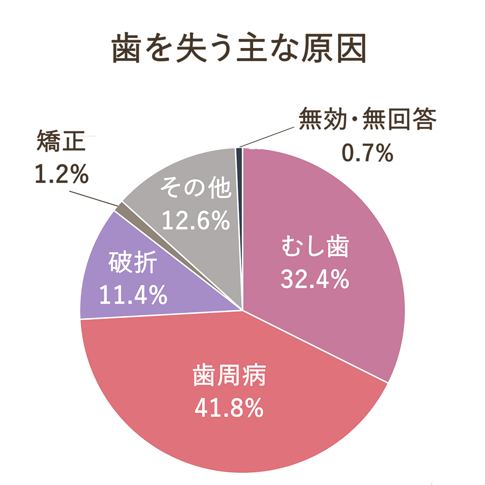 歯がある人に比べ、歯がない人は将来寝たきりになっていることも少なくないと言われています。自分の歯が残っていれば心と身体の健康を守りやすくなり、将来の充実した生活にも繋がってくるのです。